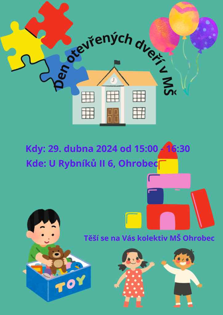 Vážení rodiče a všichni zájemci, rádi bychom vás pozvali na den otevřených dveří v naší mateřské škole, který se bude konat 29. 4. 2024 od 15:00 do 16:30.