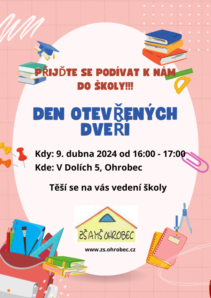 9. dubna pro Vás připravujeme den otevřených dveří v ZŠ. Přijďte se podívat mezi 16:00 a 17:00 hodinou k nám do školy na adrese V Dolích 5, Ohrobec. Rádi Vás provedeme po škole i zodpovíme Vaše otázky.