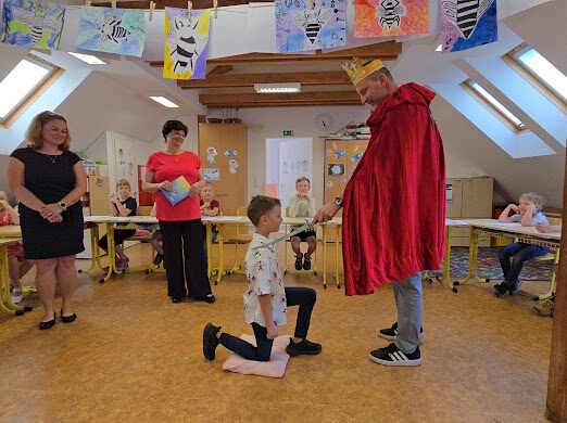 V úterý 17. června se žáci první třídy dočkali dlouho očekávaného pasování na čtenáře, na které se všichni velmi těšili. Po téměř 10 měsících usilovného boje s písmenky, slovy a větami, každý prvňáček našel odvahu a dokázal svým rodičům a ostatním přítomným, že umí číst a zaslouží si být přijat mezi rytíře čtenářského řádu. V příjemné atmosféře slavnostního pasování, které vedl sám pan ředitel, předcházelo hromadné složení čtenářského slibu.