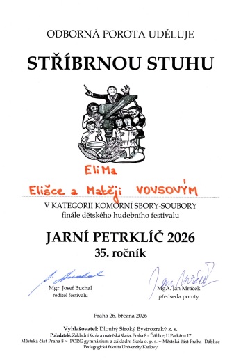 Naši žáci Eliška a Matěj, kteří studují hru na klavír v ZUŠ Jesenice, dosáhli krásného úspěchu na soutěžním festivalu Jarní petrklíč.